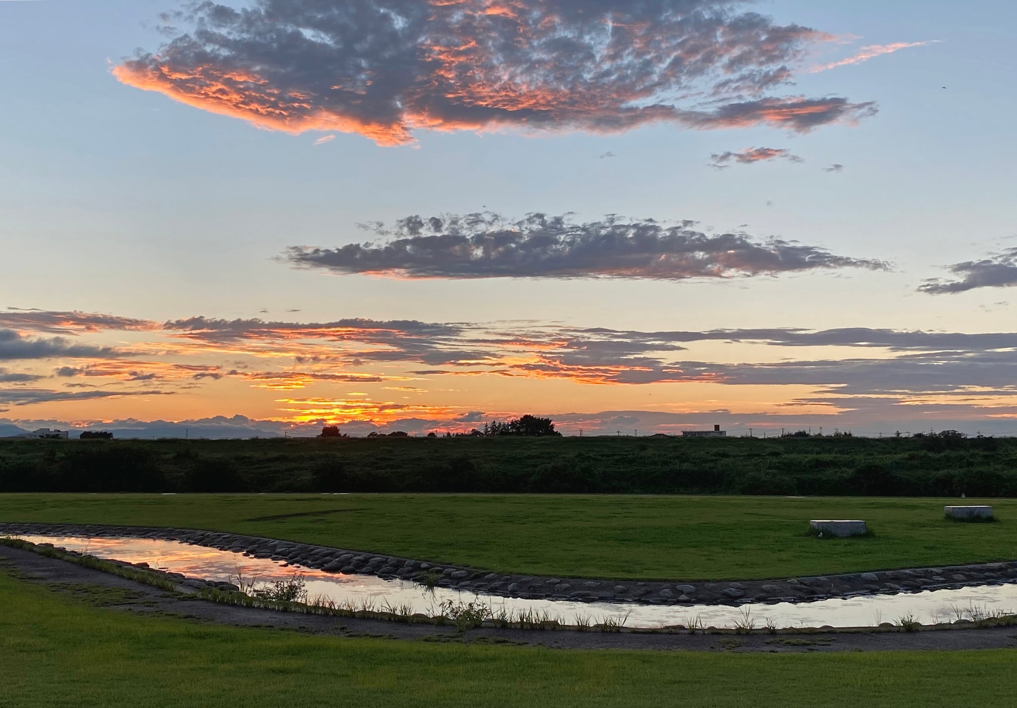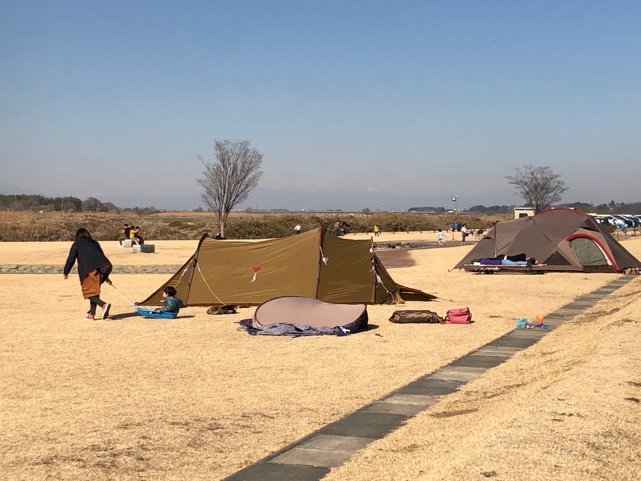 今回の出張プレーパークの会場となるのは、北本市の西側を流れる荒川のほとりにある公園『北本水辺プラザ公園』です。広々とした景色と一面の芝生広場が特徴的な公園には、週末を中心に多くの方が訪れます。テントを張ったりアウトドアチェアでくつろいだり、夕日をぼんやり眺めたりと、皆さん各々の時間をゆったりと楽しまれています。