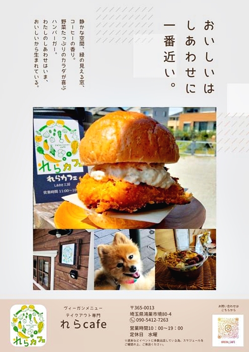 埼玉県鴻巣市にテイクアウト専門店を構える「れらカフェ」と言います。ハンバーガーから玄米ライスバーガー、焼き菓子、スイーツ等全てヴィーガンでお作りしておりますのでアレルギーにも対応商品も多数ありますので、是非お立ち寄り下さい