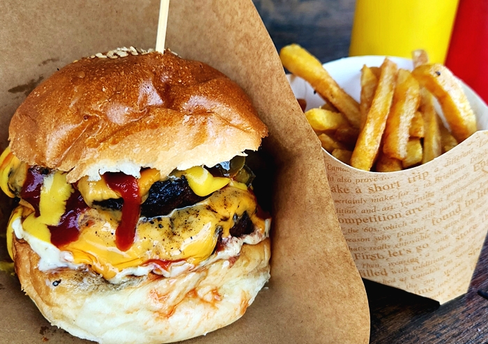 キッチンカーでアメリカンサイズのハンバーガーやステーキ串を提供しています。国産牛を粗挽きにひいており、炭火でじっくりと焼き上げてます。炭火の風味とジューシーで肉々しいパティのハンバーガーを是非ご賞味下さい。