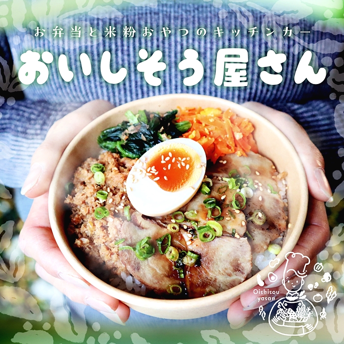 管理栄養士の作るお弁当と米粉おやつのキッチンカー、おいしそう屋さんです。お子様からご年配の方まで、みんなが楽しめる味に仕上げ手づくりの味にこだわっています。