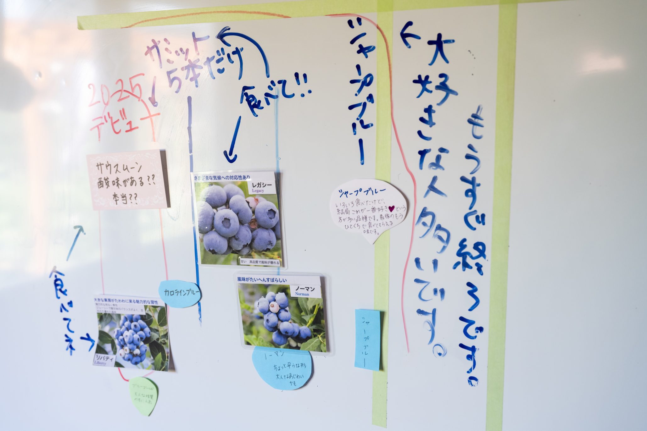 道路側からみえていた建物は、レイルサイドベリーの受付場所。トイレや販売所などの設備があり、暑い時期の摘み取りも快適に過ごすことができます。壁には手書きの園内マップが。旬を迎えた品種の紹介や、食べごろのブルーベリーの見分け方が掲示されています。