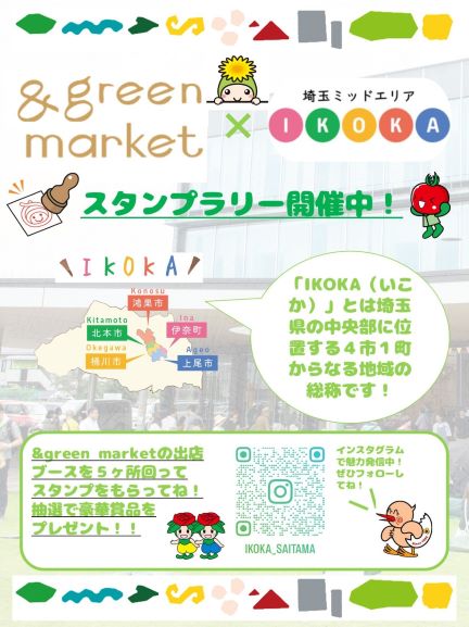 「IKOKA(いこか)」とは、埼玉ミッドエリア(県央地域)の4市1町/「I」=伊奈町、「K」=北本市、「O」=桶川市、「K」=鴻巣市、「A」=上尾市からなる地域の総称です。地域とのつながりを大切にしながら、ここでしか味わえない地域の魅力を発信しています!今回の&green marketではIKOKAアンバサダー厳選のIKOKA地域の推しスポットをまとめたマップの展示及びスタンプラリーを実施します!スタンプラリーでは&green marketの出店ブースを5ヶ所回ってスタンプをもらったら、抽選で豪華賞品をプレゼント!ぜひご来場ください!
