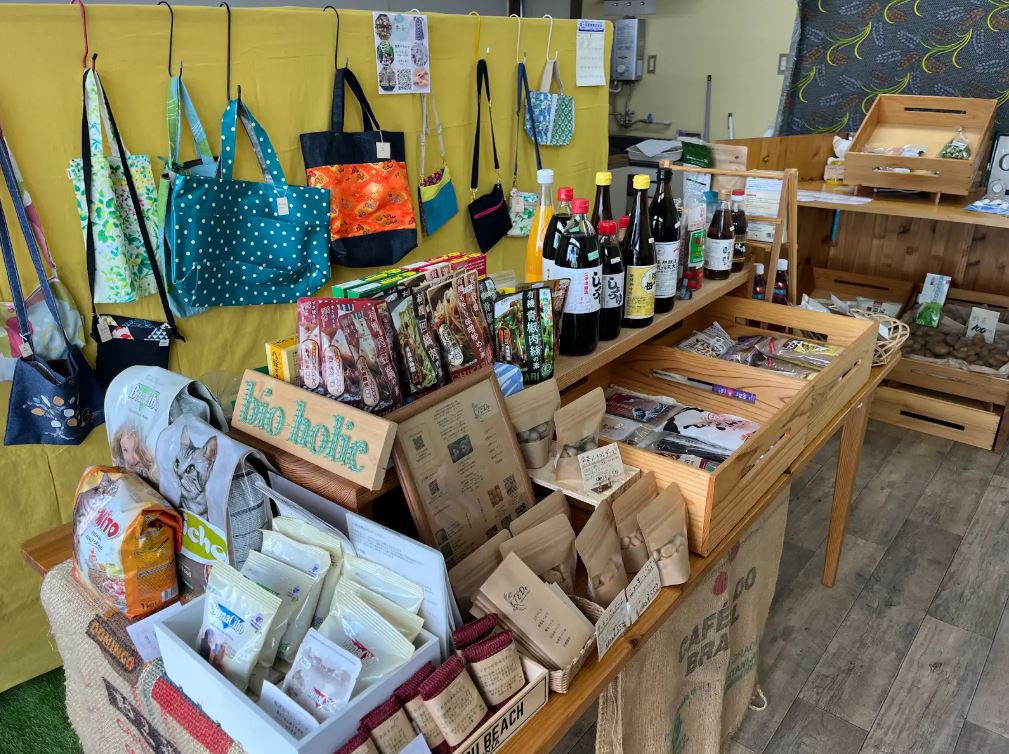 自然食品仕入人、野菜農家、クラフトバンドのカゴ作家、天然石アクセサリー屋、絵本屋がこだわりの品々を持ち寄ってできたお店です。食品も雑貨もたくさん並べているので、宝探しのように見てみてください!