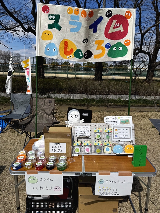 スライム屋さんです。スライムキットやスライムを売ります。今年で3回目です。スライムキットはその場で自分でスライムが作れます。もちろん家でもつくれます。自分で描いた絵で缶バッジも作れます。頑張ります。来てね!